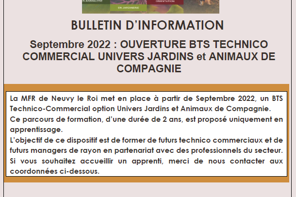 le BTS TC univers jardins et animaux de compagnie La MFR de Neuvy le Roi met en place à… Lire la suite